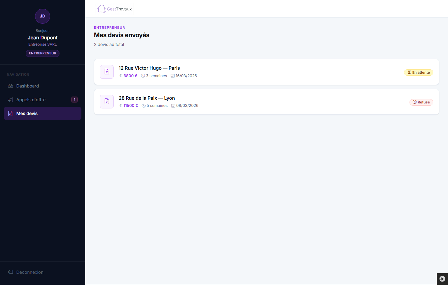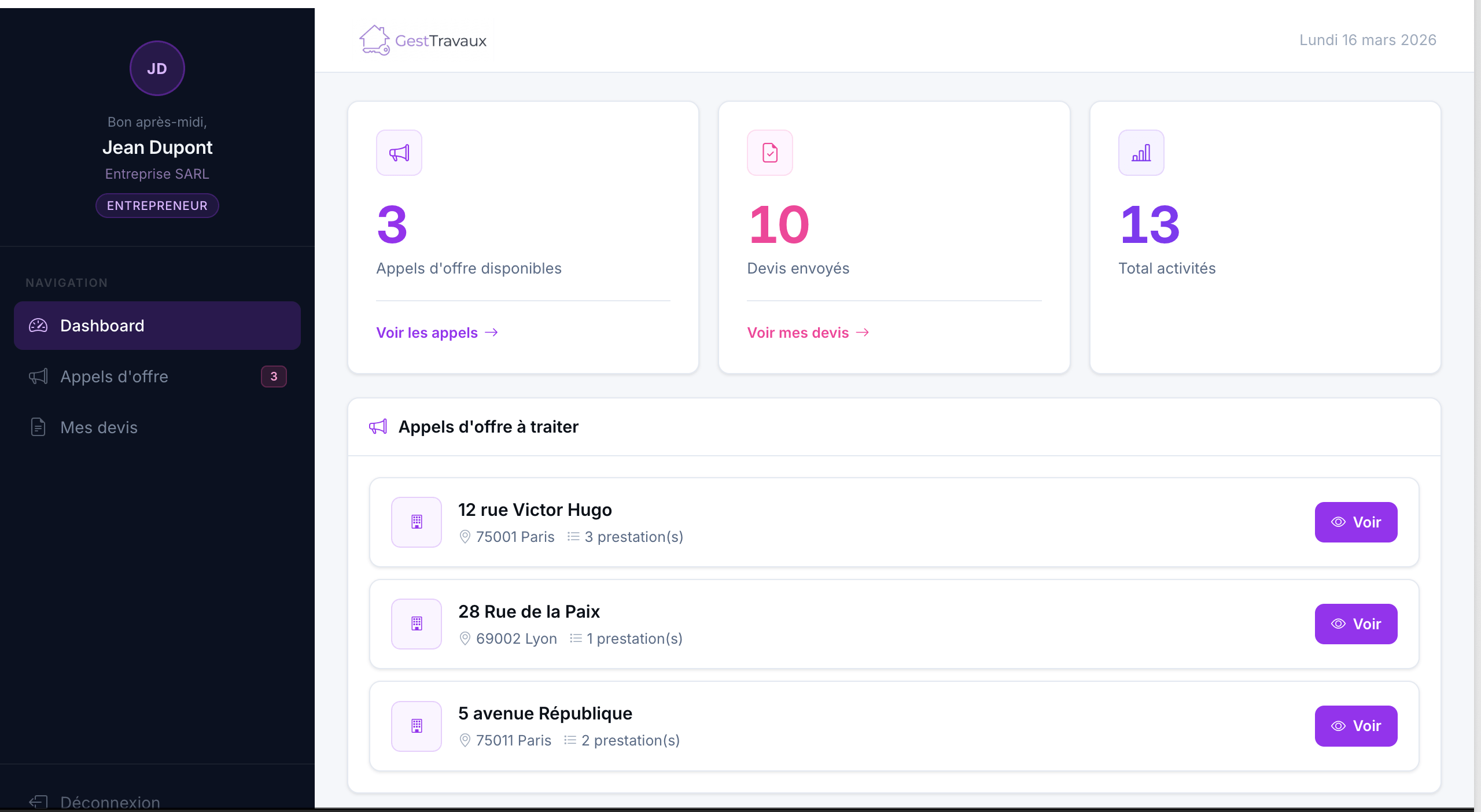 - Entrepreneurs : consultation demandes travaux, envoi devis en ligne.