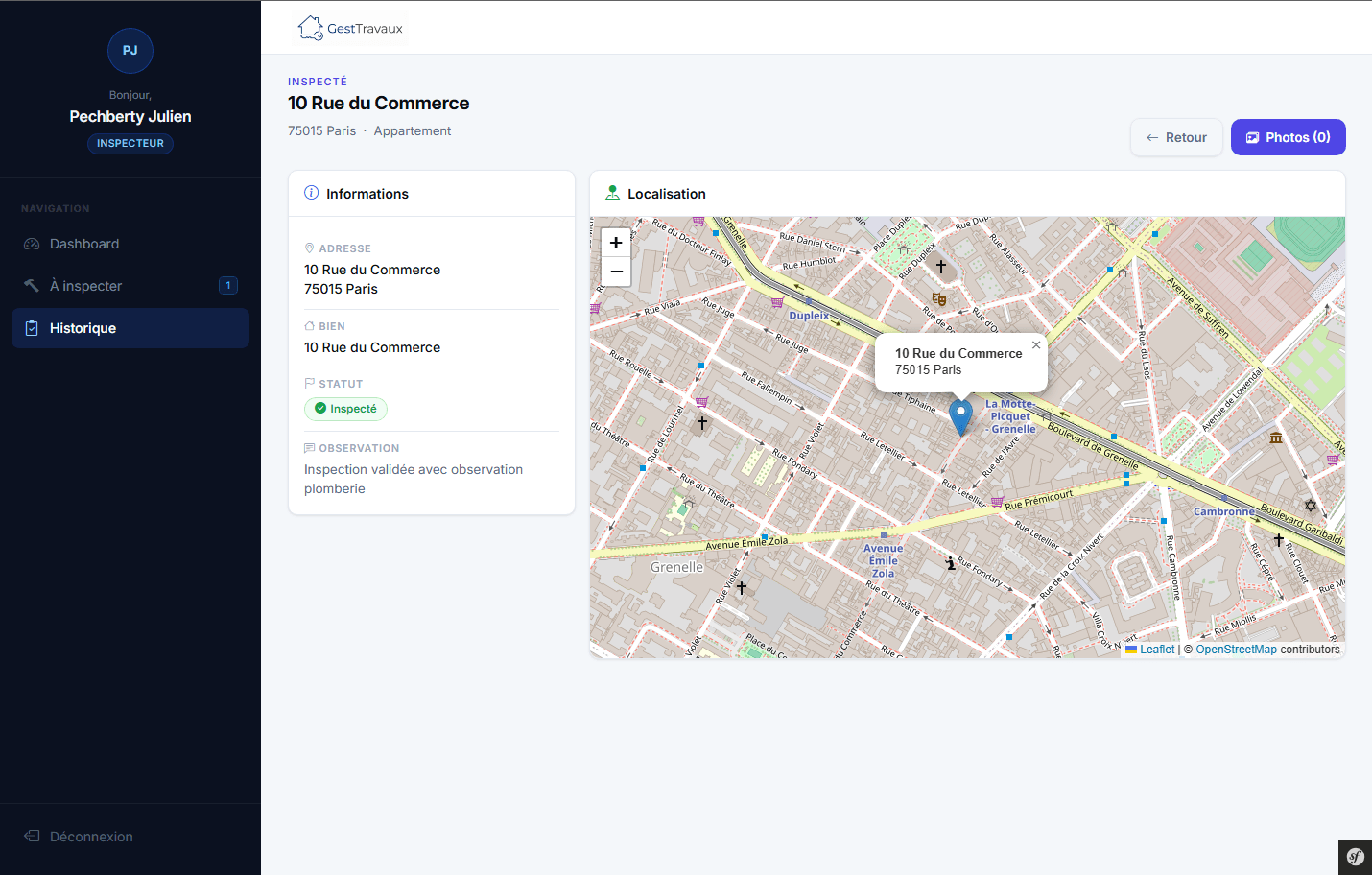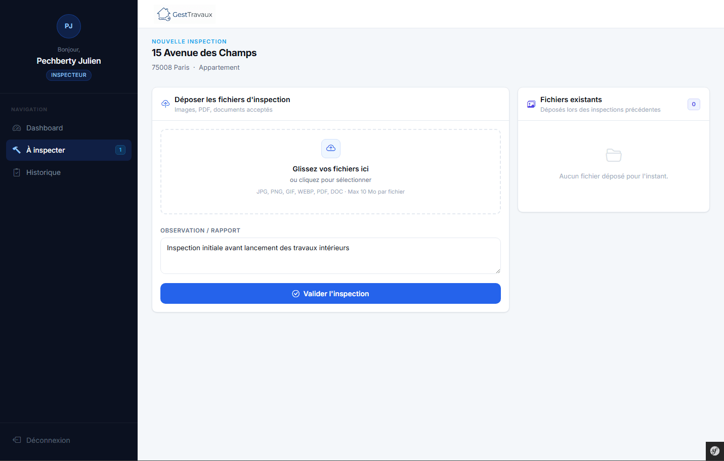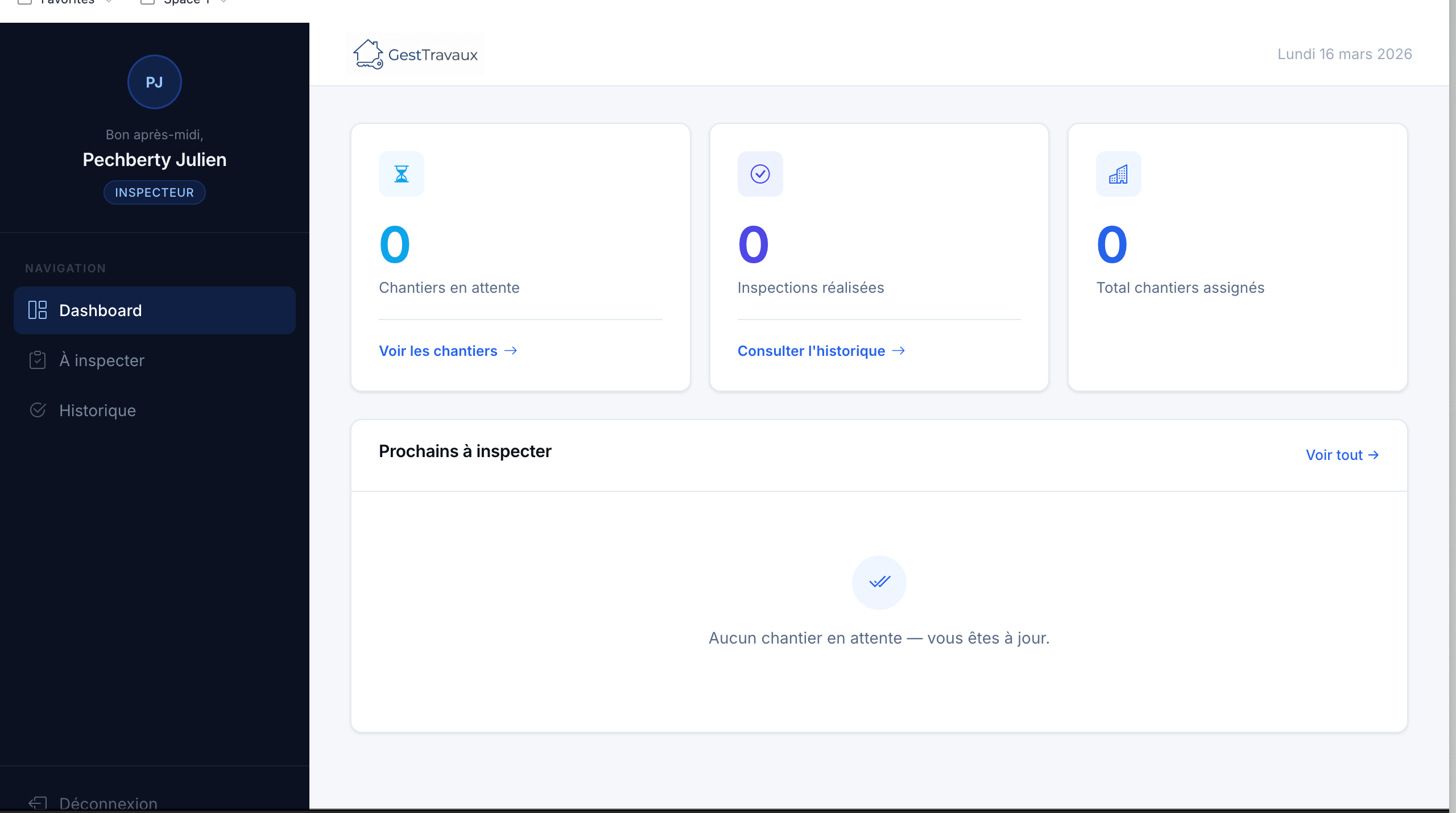 Chaque utilisateur accède ensuite à son tableau de bord personnalisé selon son rôle (inspecteur, entrepreneur, propriétaire, gestionnaire).